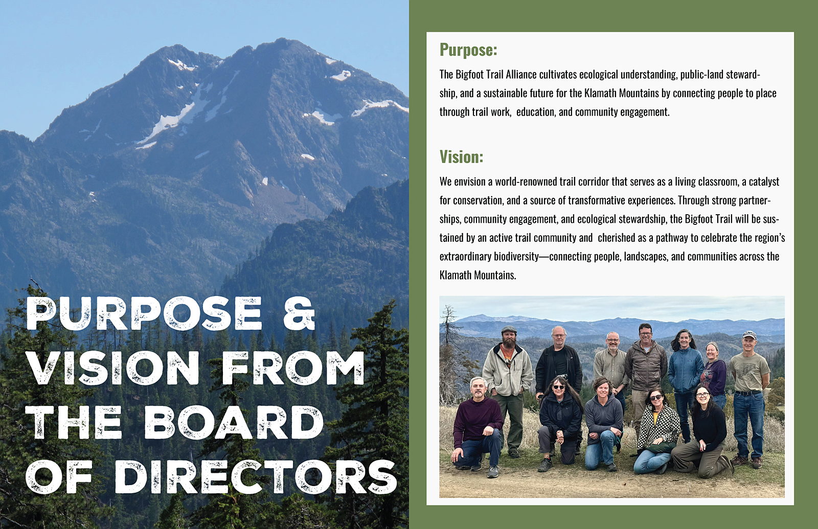 We steward the Bigfoot Trail and the wild heart of the Klamath Mountains. For more than a decade, the Bigfoot Trail Alliance (BFTA) has restored public access across a 360-mile corridor through Tehama, Trinity, and Siskiyou counties—linking communities, ecosystems, and generations through trail work, education, and community engagement.