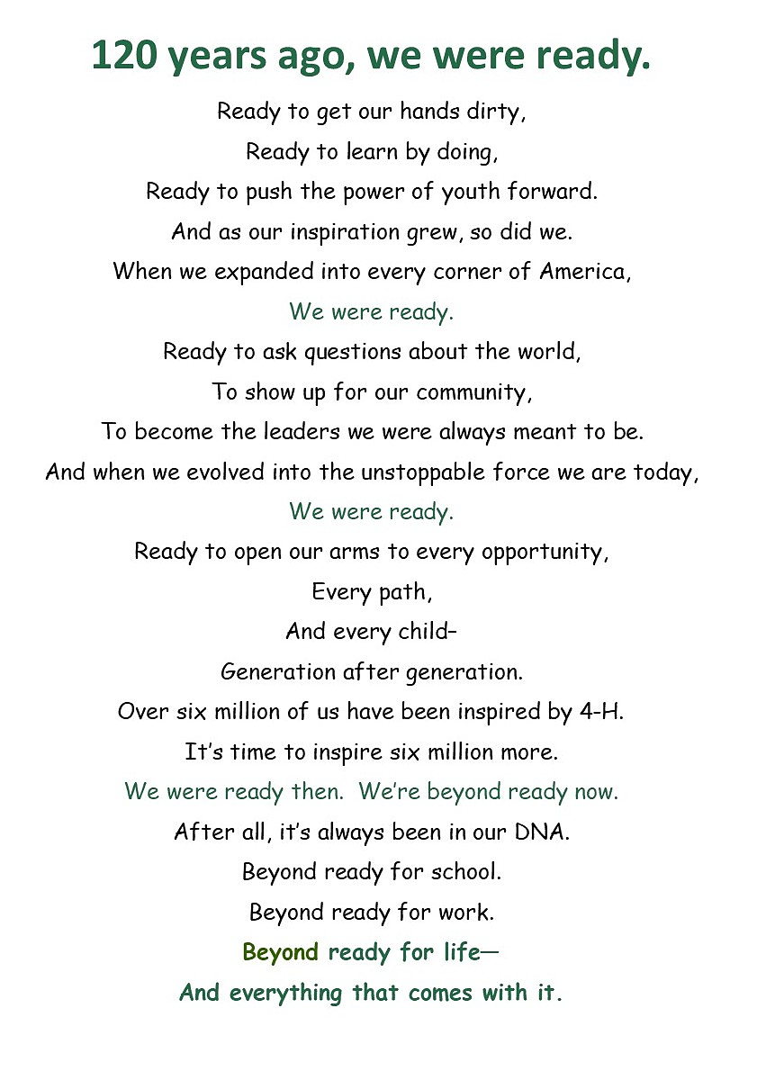 With networks reaching every corner of the country, 4-H is the nation’s largest youth development organization. More than 6 million 4-H youth in urban neighborhoods, suburban schoolyards & rural farming communities stand out among their peers: building revolutionary opportunities and implementing community-wide change at an early age.
