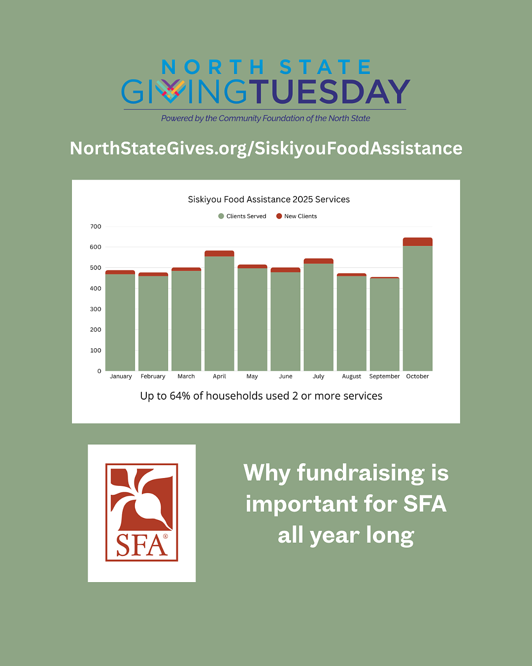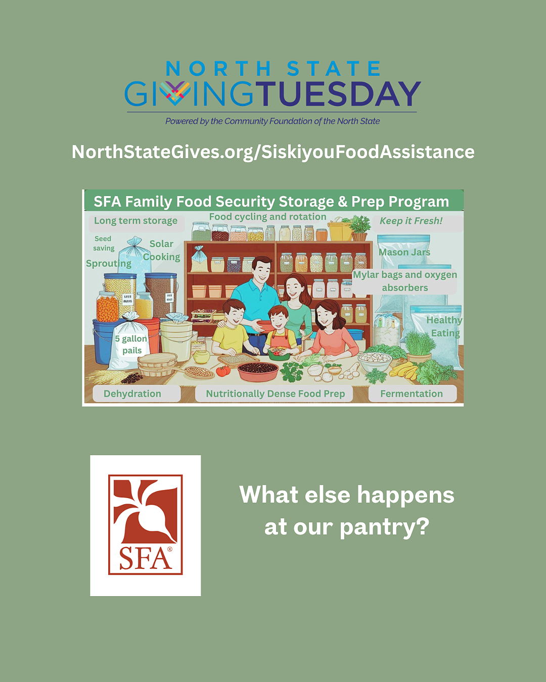 The North State Giving Tuesday event is a major source of revenue for SFA to meet the increased costs of food and fuel for weekly distributions and to support our outreach efforts in nutrition education for the public.
