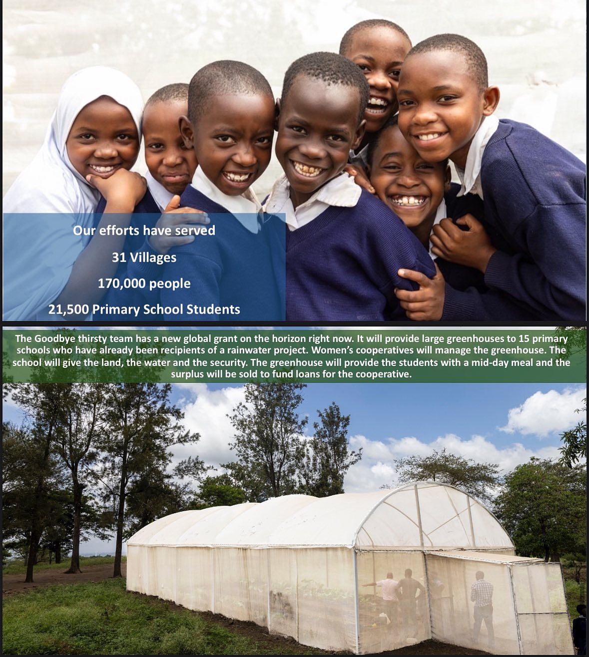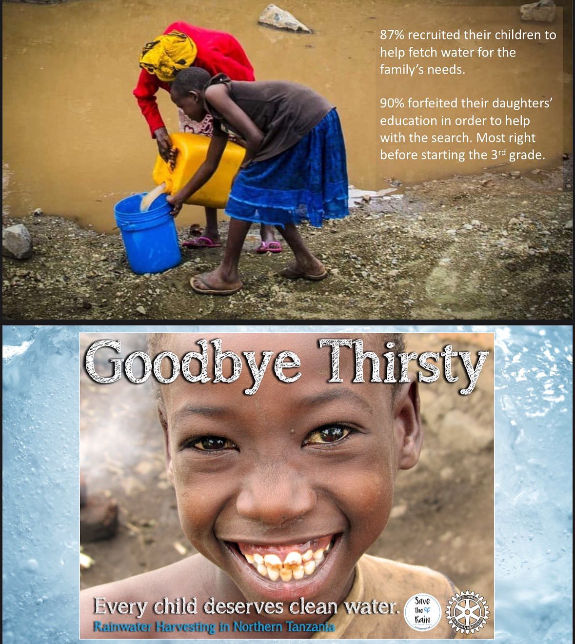 Goodbye Thirsty is a Mt. Shasta Rotary hosted project, which entails a multi-year series of projects that provide clean water to the people of Northern Tanzania by building rainwater harvesting systems on schools and residences. We do this in partnership with Save The Rain, a Mt. Shasta based non-profit that has been working in Tanzania for over a decade. We also raise matching funds from District grants and other participating Rotary clubs across the U.S.. In this Rotary partnership with Save The Rain, we have brought reliable access to clean water to over 137,400 people in 27 different villages at the cost of just $1,100,000.