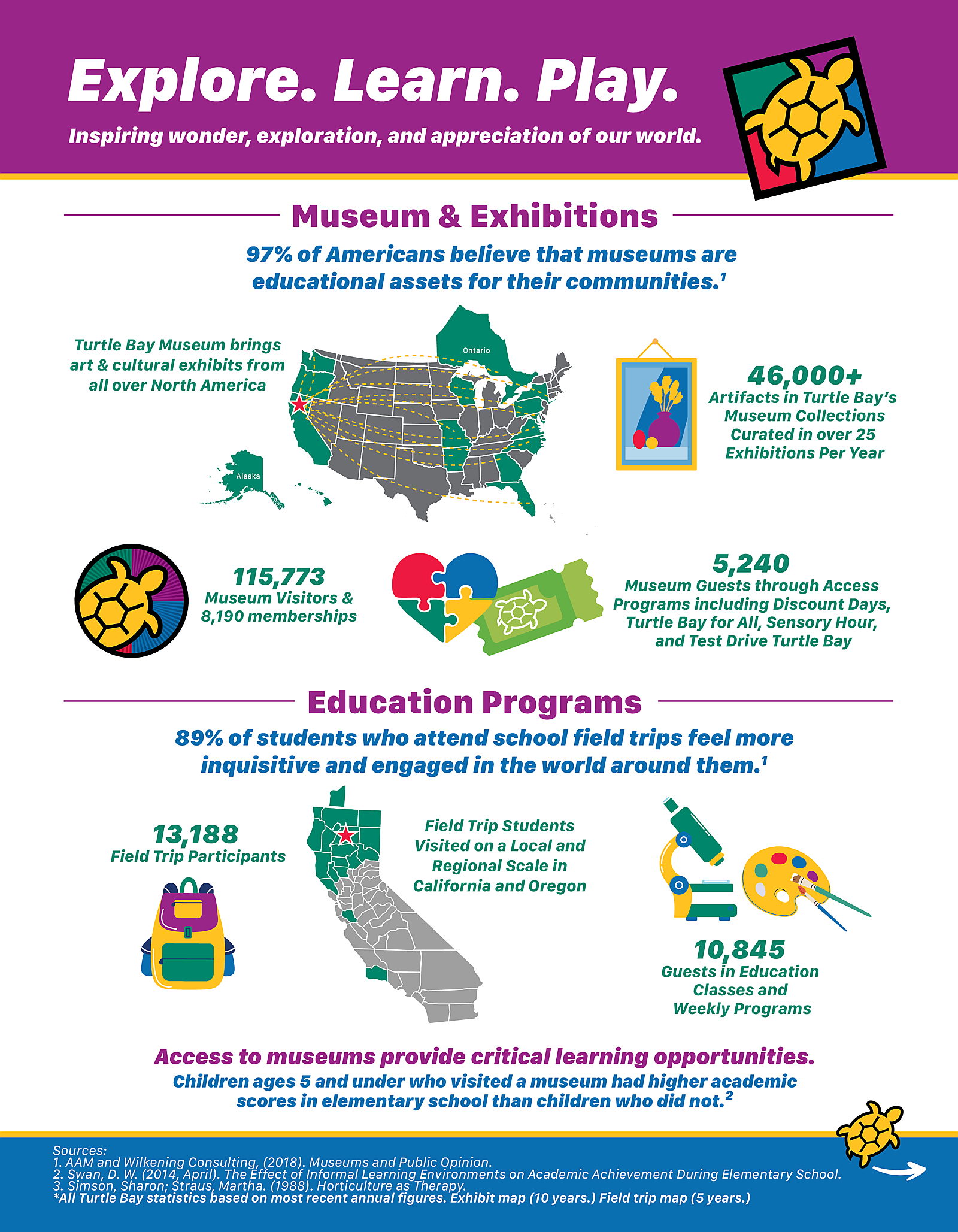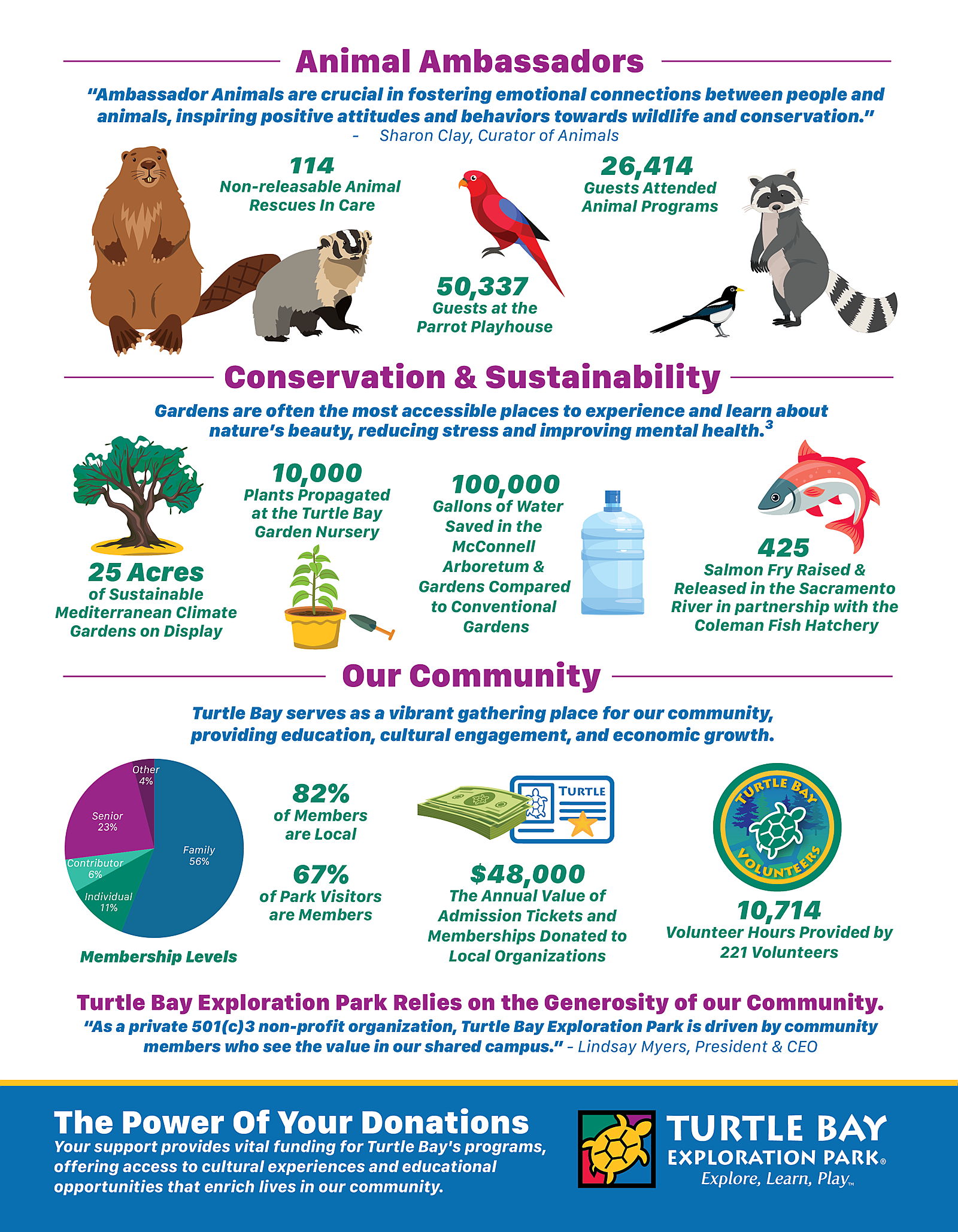 Turtle Bay is a gathering place for our community, inspiring wonder, exploration, & appreciation of our world! At Turtle Bay, we are deeply committed to being responsible stewards of the resources entrusted to us. Every dollar is thoughtfully allocated to ensure the greates possible impact. Our ability to serve the community at the highest level depends on the generosity and engagement of our community.